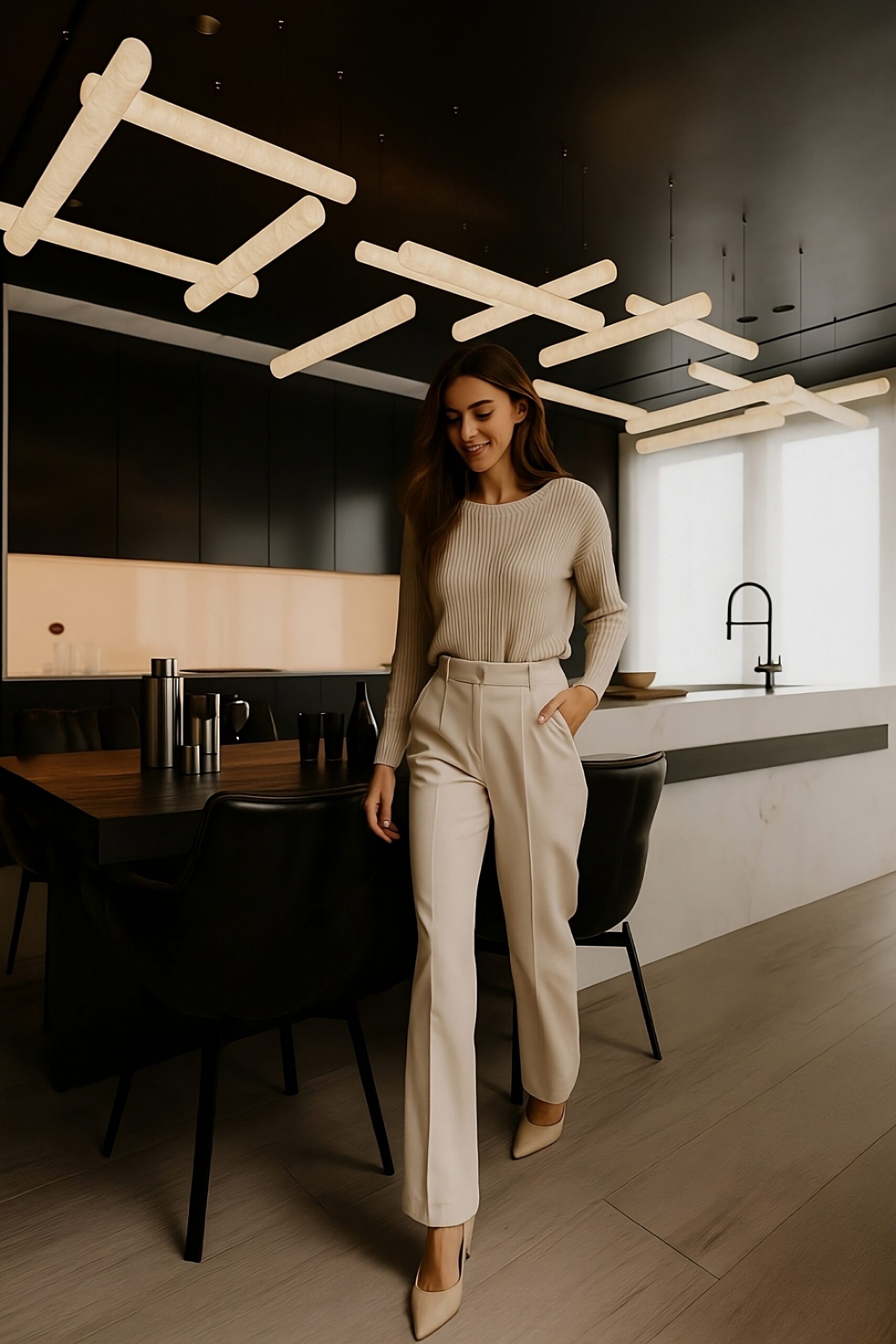 W jadalni królują ikoniczne krzesła B&B Italia Husk, które doskonale komponują się z wyrafinowanym, czarnym tłem. W strefie wypoczynkowej znajdziemy wygodne fotele Fat-Sofa Armchair od B&B Italia, które zapewniają komfort na najwyższym poziomie. Całość dopełnia designerskie oświetlenie – lampa SUMATRA H + HF by Atelier Alain Ellouz, która nadaje wnętrzu wyjątkowego charakteru i ciepła.